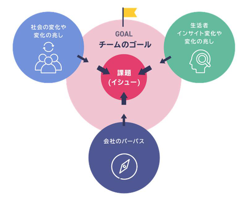 事業開発コンサルティング/サービスデザイン領域においては、設定したチームのゴールを取りまく環境を正確に把握するため、独自のフレームワークをベースに、「電通未来曼荼羅」※2を活用した社会変化の兆し、深堀インタビューやデスクリサーチを元にした生活者インサイトの変化/兆し、そして自社のビジョンやパーパスに対する解釈をインプットします。