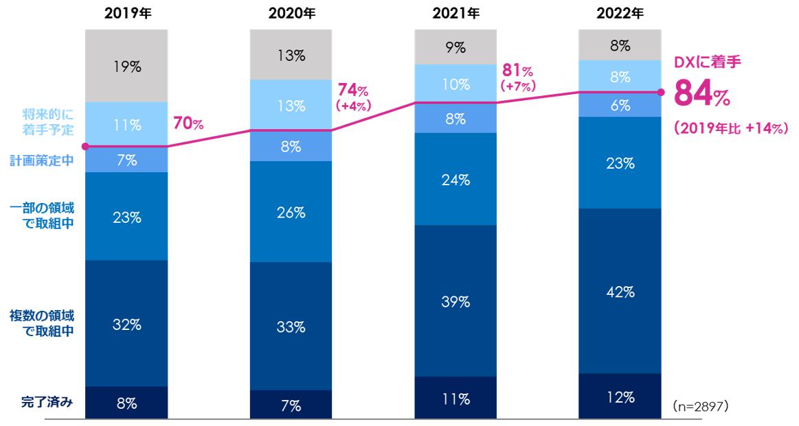 DXに着手している企業は84%。DXを推進する上での障壁も減少傾向にあり、DX推進は3年間のコロナ禍を経て、定着・一般化