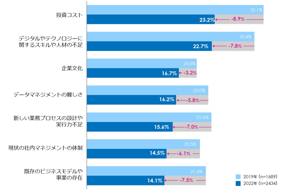 ② DXを推進する上での障壁は全体的に減少傾向。コロナ禍を経て、DX推進環境が整ってきた状況。‘既存事業の壁’も低下