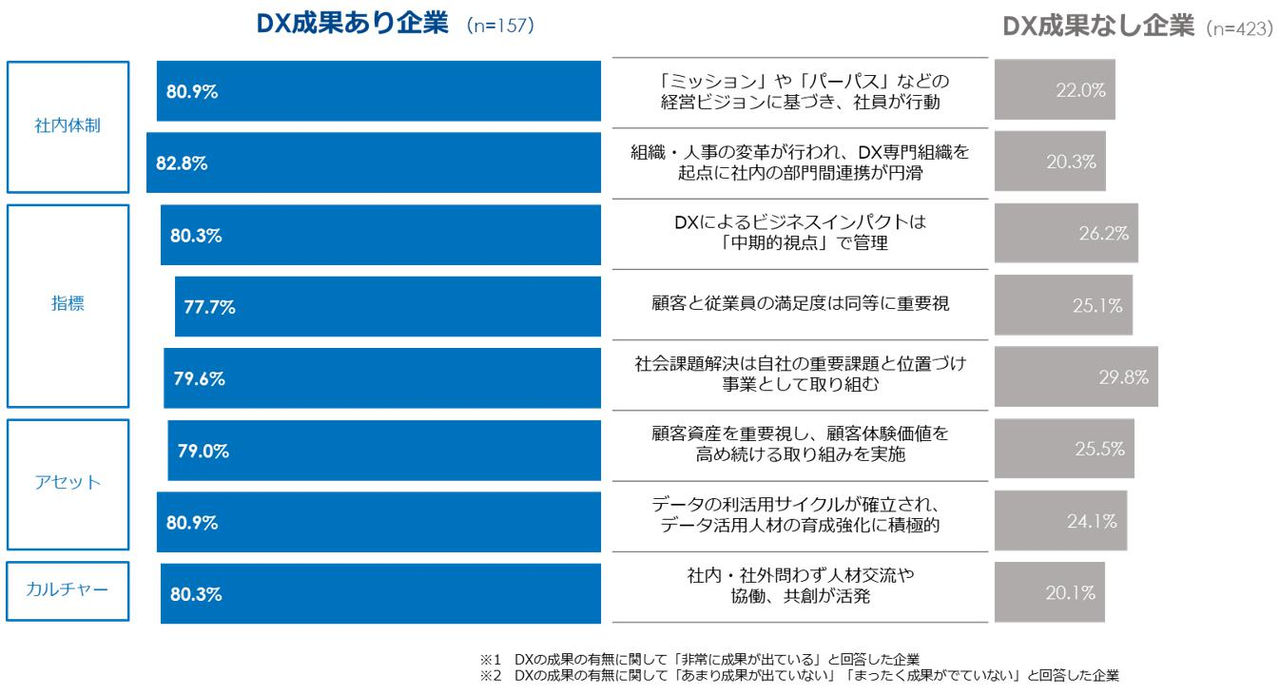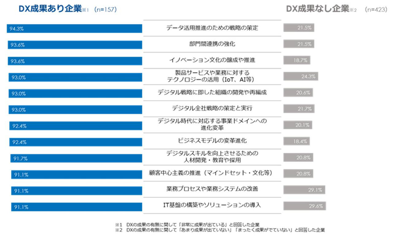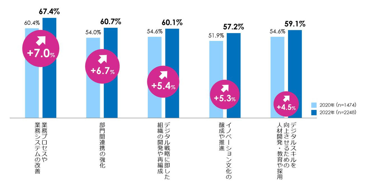 DXの成果創出領域は、「業務プロセス/業務システムの改善」といった従来からの改善領域に加え、「部門間連携の強化」「デジタル戦略に即した組織開発・再編成」「イノベーション文化の醸成や推進」「デジタルスキルを向上させるための人材開発・教育・採用」など、組織/企業文化/人材といった基盤領域の伸びが高い
