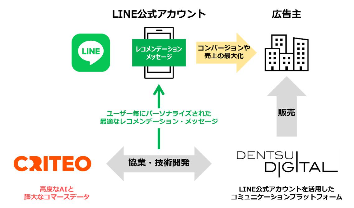 株式会社電通デジタル(本社:東京都港区 代表取締役社長執行役員:瀧本 恒 以下、電通デジタル)は、コマースメディアを展開するCriteo社(本社:フランス 日本代表取締役:グレース・フロム 以下、Criteo)との協業により、LINE公式アカウントにおける新規顧客獲得・既存顧客育成支援サービス「TONARIWA」※1と、CriteoのAI技術と膨大な購買データを活用する「レコメンデーション メッセージ for LINE公式アカウント Powered by CRITEO」ベータ版を連携させた高度なレコメンデーション・メッセージ機能の提供を、6月より開始します。