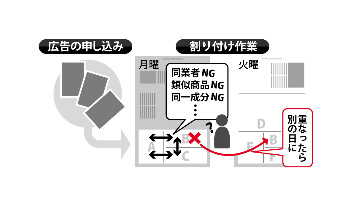特にそれらの広告主は、同業他社や自らの商品やサービスと同系統の内容を同じ日に掲載しないように要望することが多くあります。また、掲載面によってのカラー・モノクロ掲載の調整など全て加味しながら掲載まで運びます。このシステムは、それら諸条件をAIに読み込ませて瞬時に割り付けを完成させることで、一連の作業でかかる膨大な調整事項を軽減し、より効率的かつ最適な紙面割付を目指します。