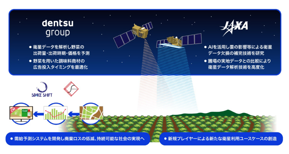 株式会社 電通グループ(本社:東京都港区、社長:五十嵐 博、以下、電通グループ)と宇宙航空研究開発機構(本社:東京都調布市、理事長:山川 宏、以下、JAXA)は、JAXA宇宙イノベーションパートナーシップ(J-SPARC)※1の下、人工衛星データ活用による、広告の高度化を通じた需要の創出と需給の最適化の実現に向け、共創活動を開始しました。