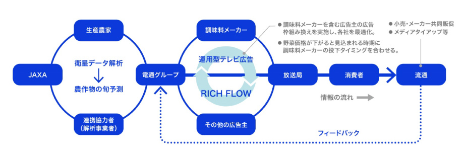 株式会社電通は、2020年に、テレビ広告の効果を向上させる基盤システムRICH FLOW※2を開発しました。今回の共創では、連携協力者※3と共に、衛星データを解析して農作物の出荷量や出荷時期および価格の予測モデル構築・高精度化を行った上で、RICH FLOWを用いることで、当該作物を食材として用いる調味料商材の広告出稿の種類・タイミングの最適化を目指します。これにより、広告効果の向上だけでなく、旬な農作物の廃棄ロスを低減し、SDGs目標達成にも貢献することを目指します。