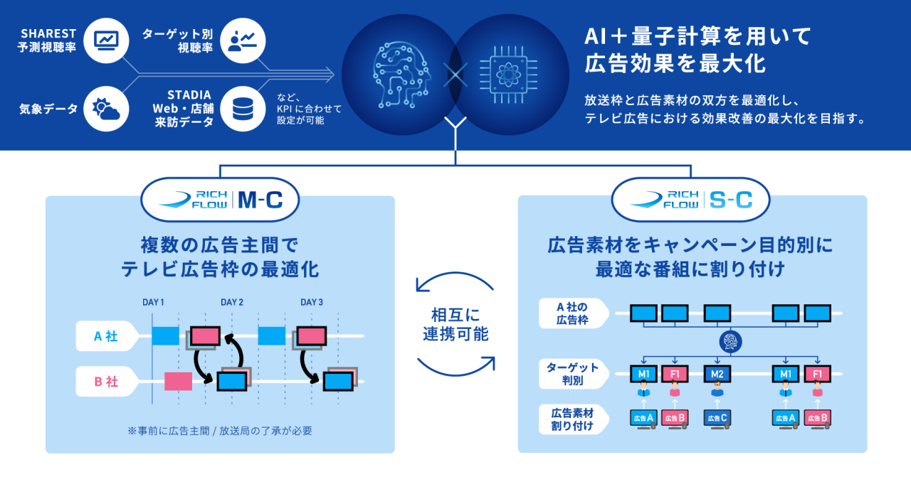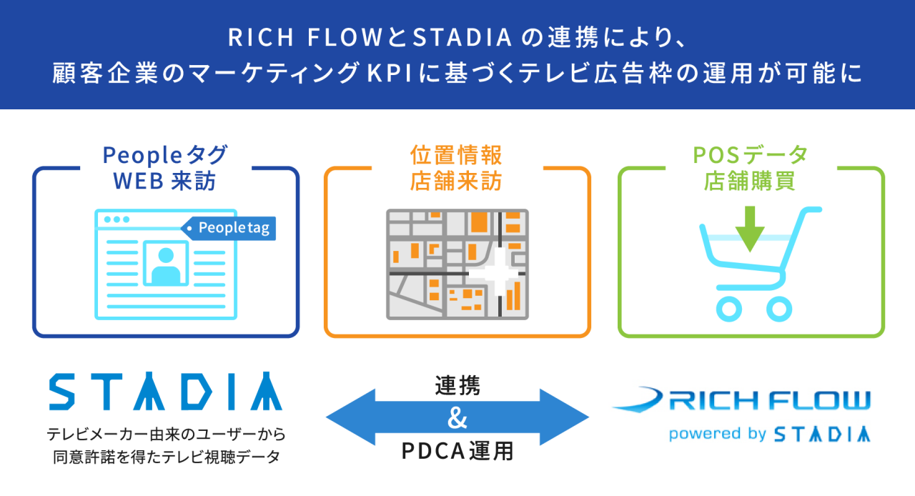 「従来型の性年代別の視聴率だけでなく、ウェブサイトの来訪数や成約数、店舗来訪者数、特定商材の購入数などのデータを活用し、顧客企業のマーケティングKPIに直結する指標を用いたテレビ広告枠の運用を可能にする「RICH FLOW powered by STADIA」を追加しました。