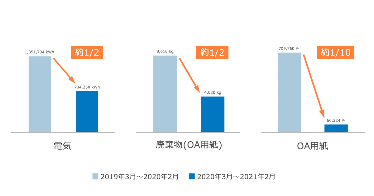 オフィスの環境負荷低減を示すものとして、顕著なものが電力や紙の使用量です。2019年3月~2020年2月と2020年3月~2021年2月を比較すると、電気も紙の廃棄物も約半分になり、OA用紙については10分の1に減少しました。