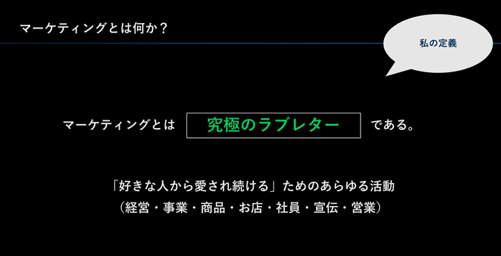 まとめると、マーケティングとは、多くの人に長く愛されることで商品の売上を伸ばし、その売上で新たな事業を興し、企業がさらに多くの生活者を幸せにしていく、その営み全体を支援する活動を指すと、私は考えています。