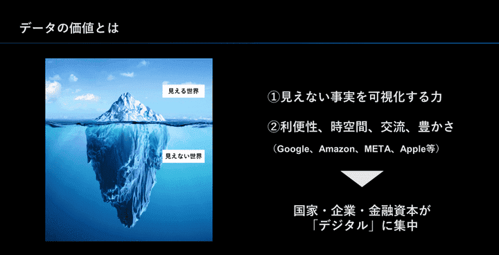 データには、日常の利便性を高めてくれるという価値もあります。いつでも検索できるし、いつでも買い物できるし、遠く離れた人と交流できます。データを武器にそうした利便性を追求することで巨大化してきたのがGAFAです。日本でも、データを活用して新しい豊かさを生み出していくビジネスがどんどん出てきています。ここに対して、日本を含むあらゆる国連加盟国や、企業、金融資本がどんどん資金を流入しており、データエコノミーといわれる巨大経済圏が広がっています。