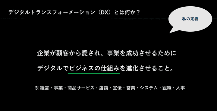 企業の本質的な目的は成長です。顧客から愛されて、支持されて、その事業を拡大して、そして成長していくということにあります。その実現のために必要なのがデジタルの力、データの力です。データが真に力を発揮できるよう、ビジネスの仕組みをデジタルでどんどん新しくしていく必要があります。デジタルを活用して、ビジネスの仕組みを進化させること、それが私の考えるDXの定義です。