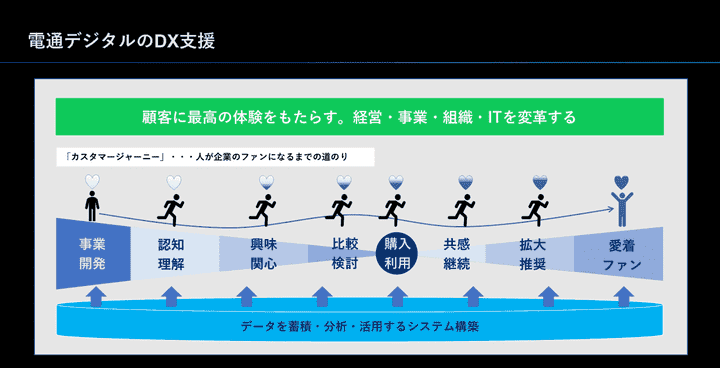 「顧客に最高の体験をもたらすために、経営戦略・事業戦略・組織・ITを変革していく」というのが、電通デジタルのDXの基本的な考え方です。