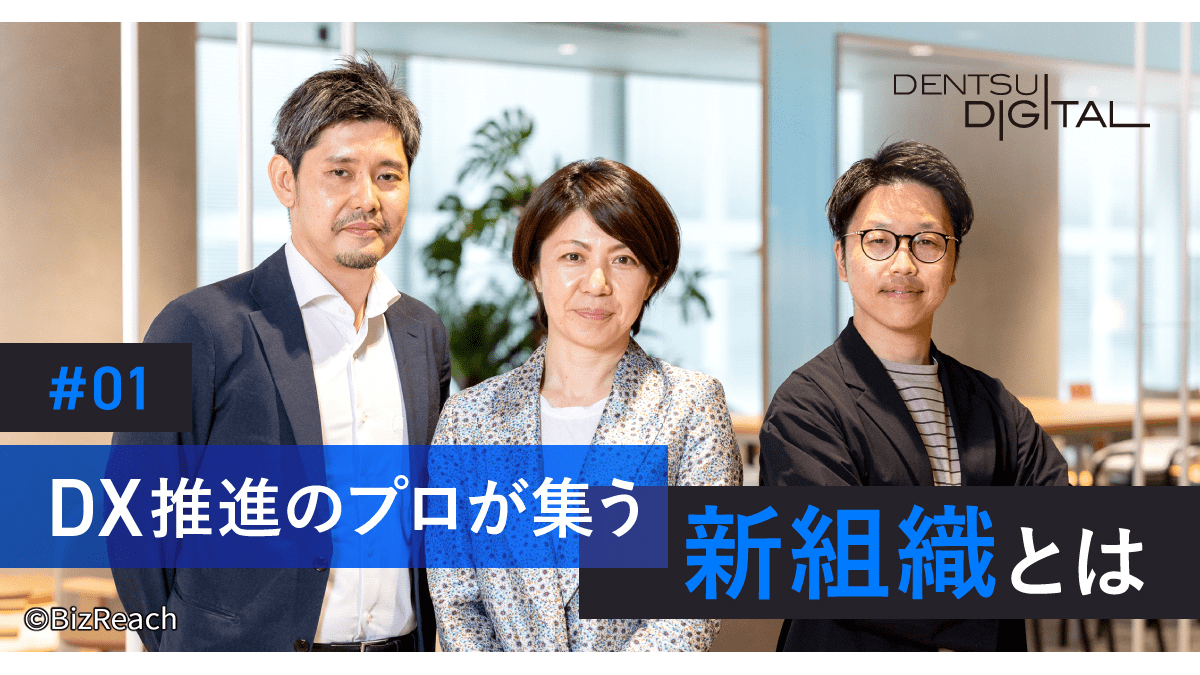 コンサルティングから開発、実行支援まで総合的なソリューションを提供する電通デジタル。2022年1月には、DX(デジタルトランスフォーメーション)推進による事業変革のサポートを強化すべく、「トランスフォーメーション領域」を新設しました。この新組織による提供価値や働く魅力について、執行役員およびビジネストランスフォーメーション部門の部門長とビジネスコンサルタントにお話を伺いました。