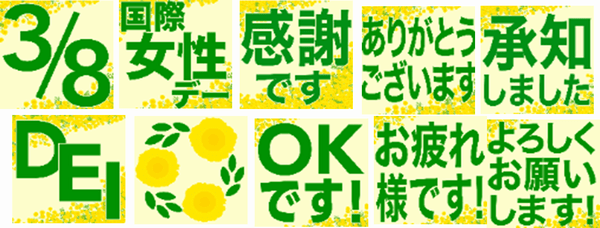 黄色と緑を基調としたリアク字(Slack専用の絵文字リアクション)を制作しました。これをきっかけにして、国際女性デーを知らなかった人にも意識してもらえるように、という意図です。