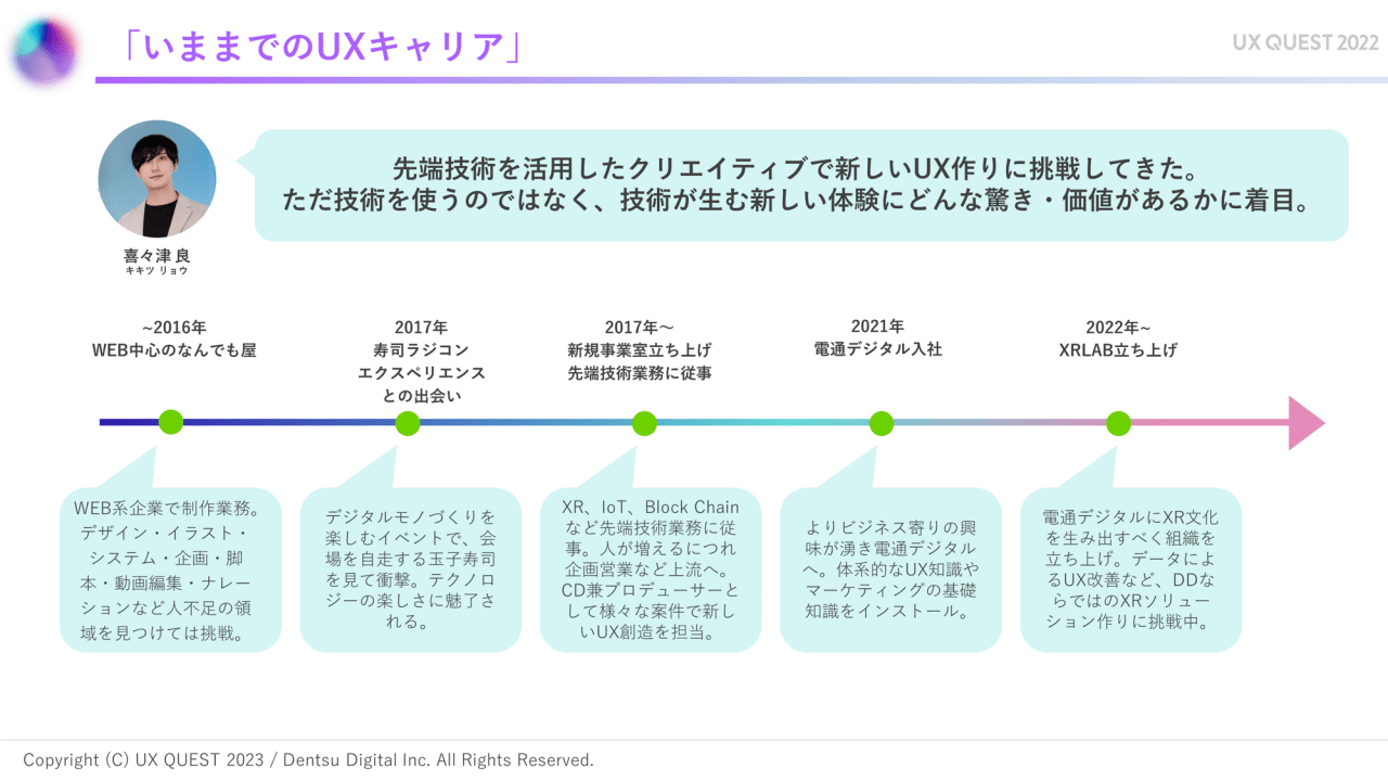 喜々津良(以下、喜々津) XRメタバースやIoTなど、先端技術を活用したUXデザインに携わってきて、2021年、電通デジタルに入社しました。現在はR&Dプロジェクト「XRLAB」のリーダーとして、新しい体験をどのように社会実装していくかに挑戦しています。