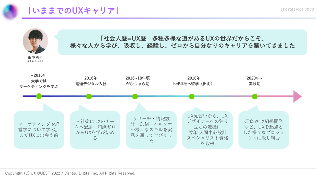 田中秀斗(以下、田中) 2016年、電通デジタルに新卒入社して以来、UXデザインを中心に、リサーチ、情報設計、カスタマージャーニーマップ、ペルソナ、人間中心設計など、いろいろな業務を幅広く行ってきました。現在は、クライアントにUX研修プログラムを提供したり、組織開発プロジェクトに従事したり、幅広いプロジェクトに取り組んでいます。今回はファシリテーターを務めます。