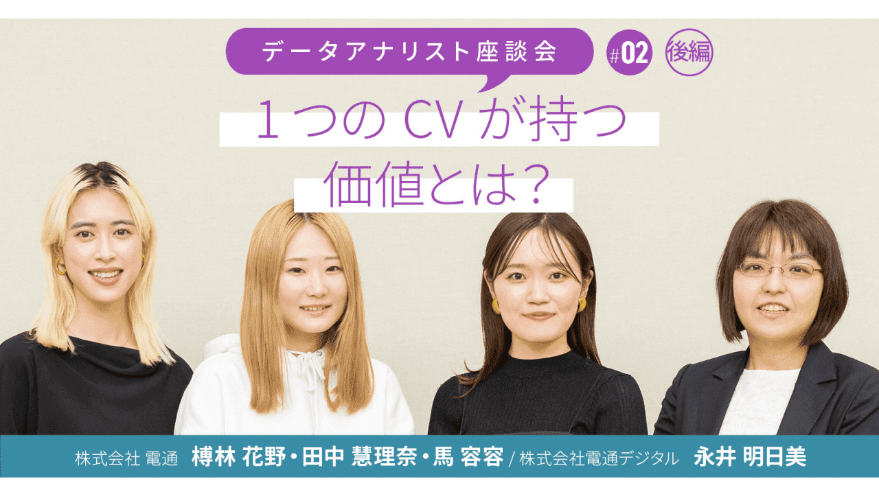 電通グループで働くデータアナリストによる座談会第2弾では、株式会社 電通 榑林花野氏、田中慧理奈氏、馬容容氏、株式会社電通デジタル 永井明日美氏の4名に話を聞きました。後編では、特に印象深かった仕事や、やりがいや達成感、今後チャレンジしたい領域などを深掘りしていきます。