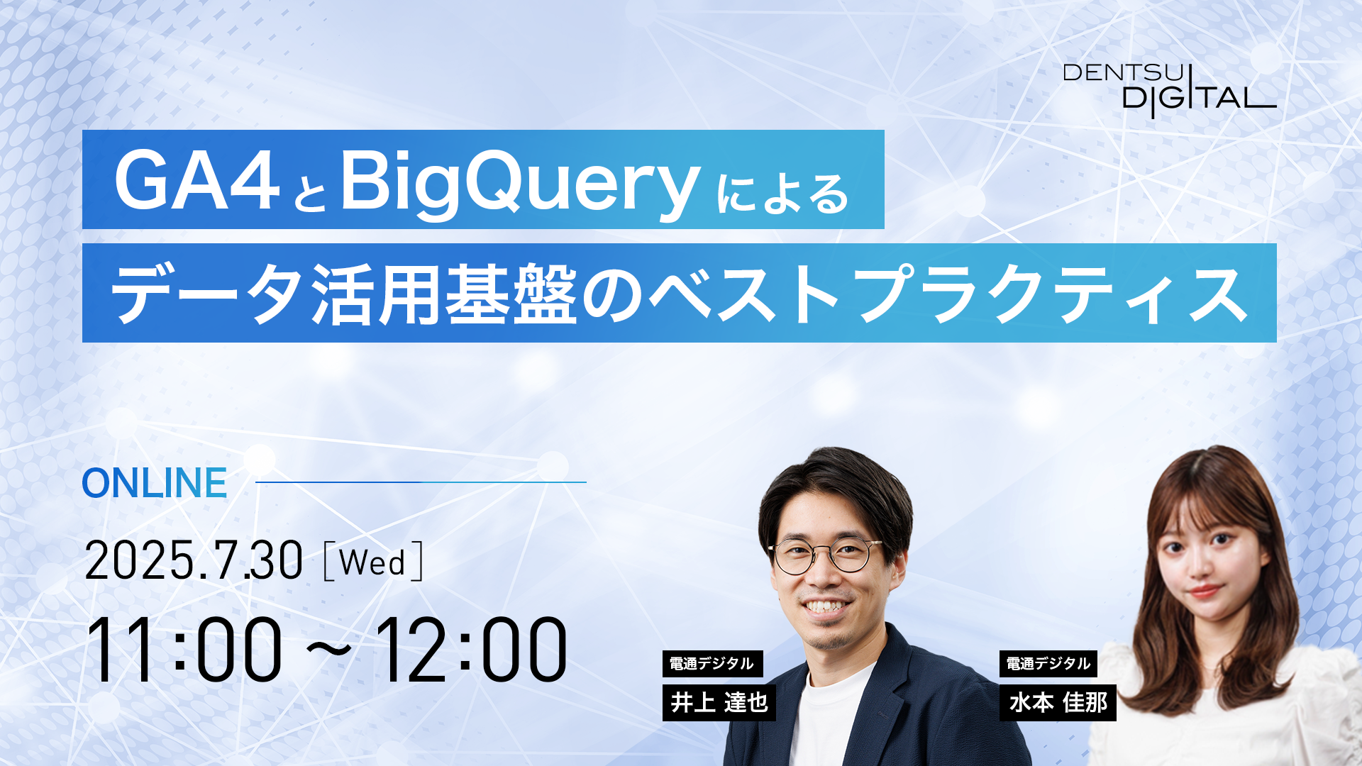 本セミナーでは、GA4利用におけるデータ取得や設計について詳しく解説します。データの効果的な活用に向け、BigQueryをデータ基盤としたダッシュボードによる可視化、データ統合などのデータ活用基盤のベストプラクティスをご紹介します。