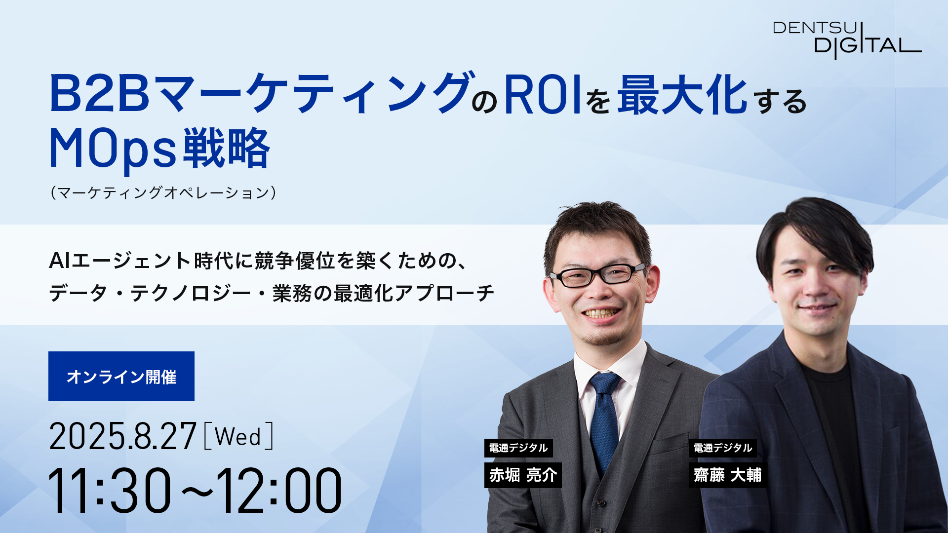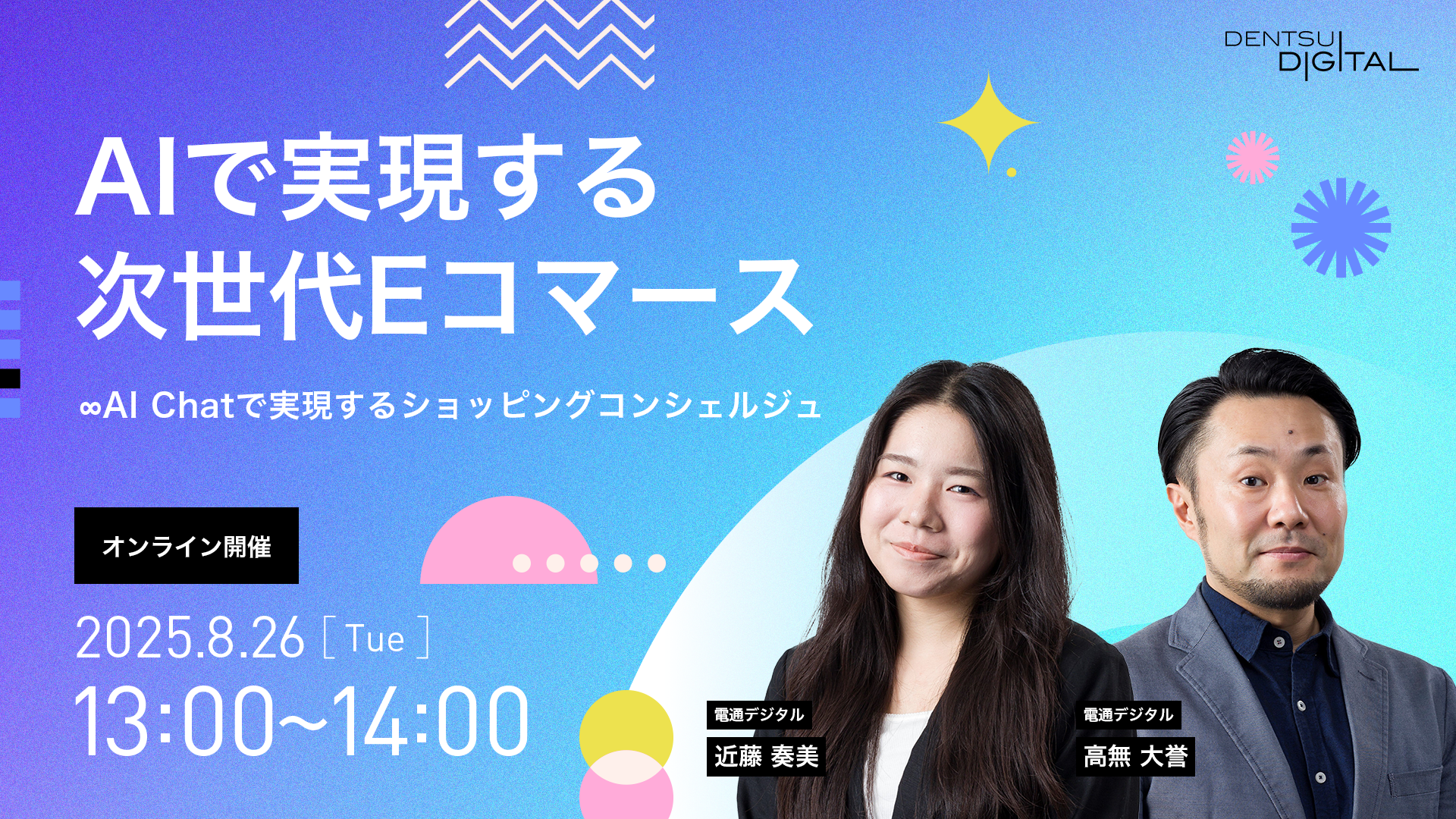 本セミナーでは、電通デジタルが構築・実践してきた生成AIの活用事例から、「分析」「資料作成」「クリエイティブ反応シミュレーション」といった日々の実務を効率化し、より質の高いアウトプットを実現するためのソリューションを厳選してご紹介します。さらに、Google Cloud を活用した実装アーキテクチャや導入業務効果についても解説します。