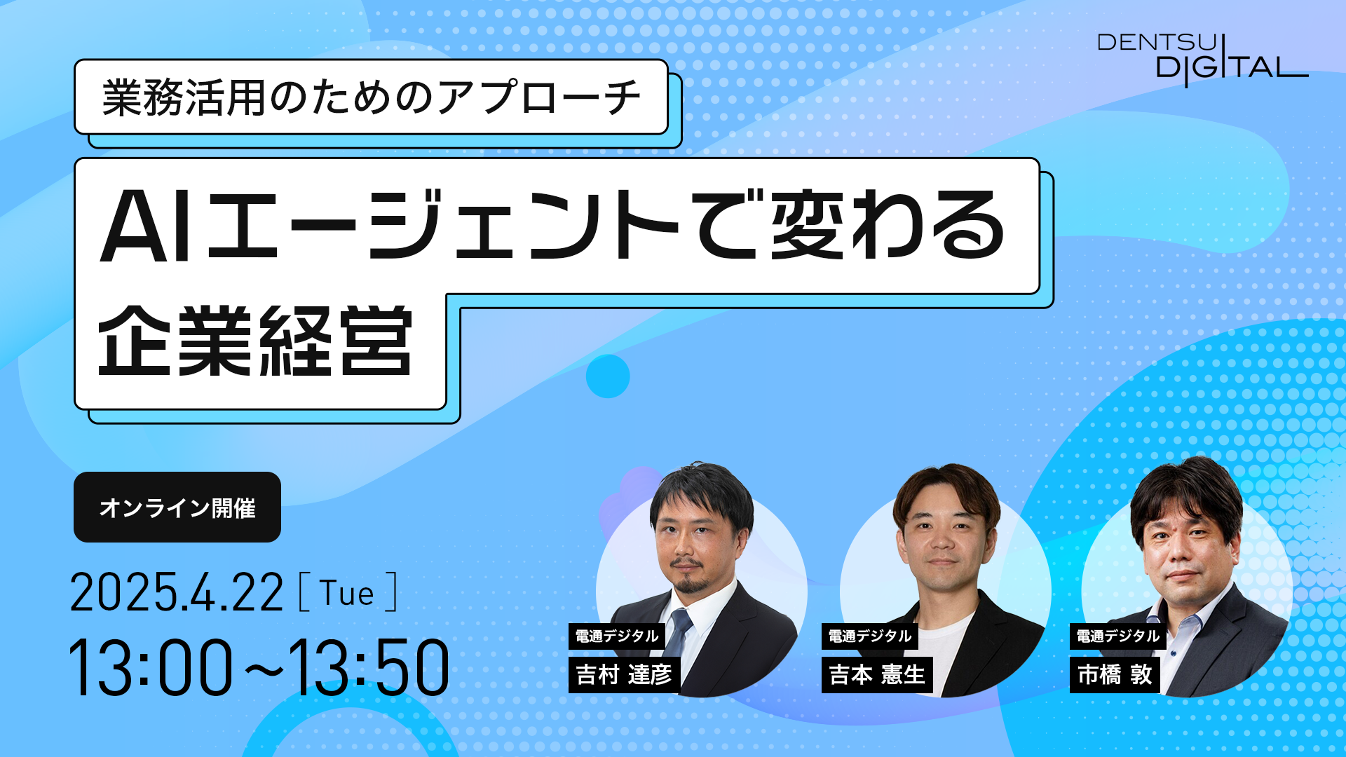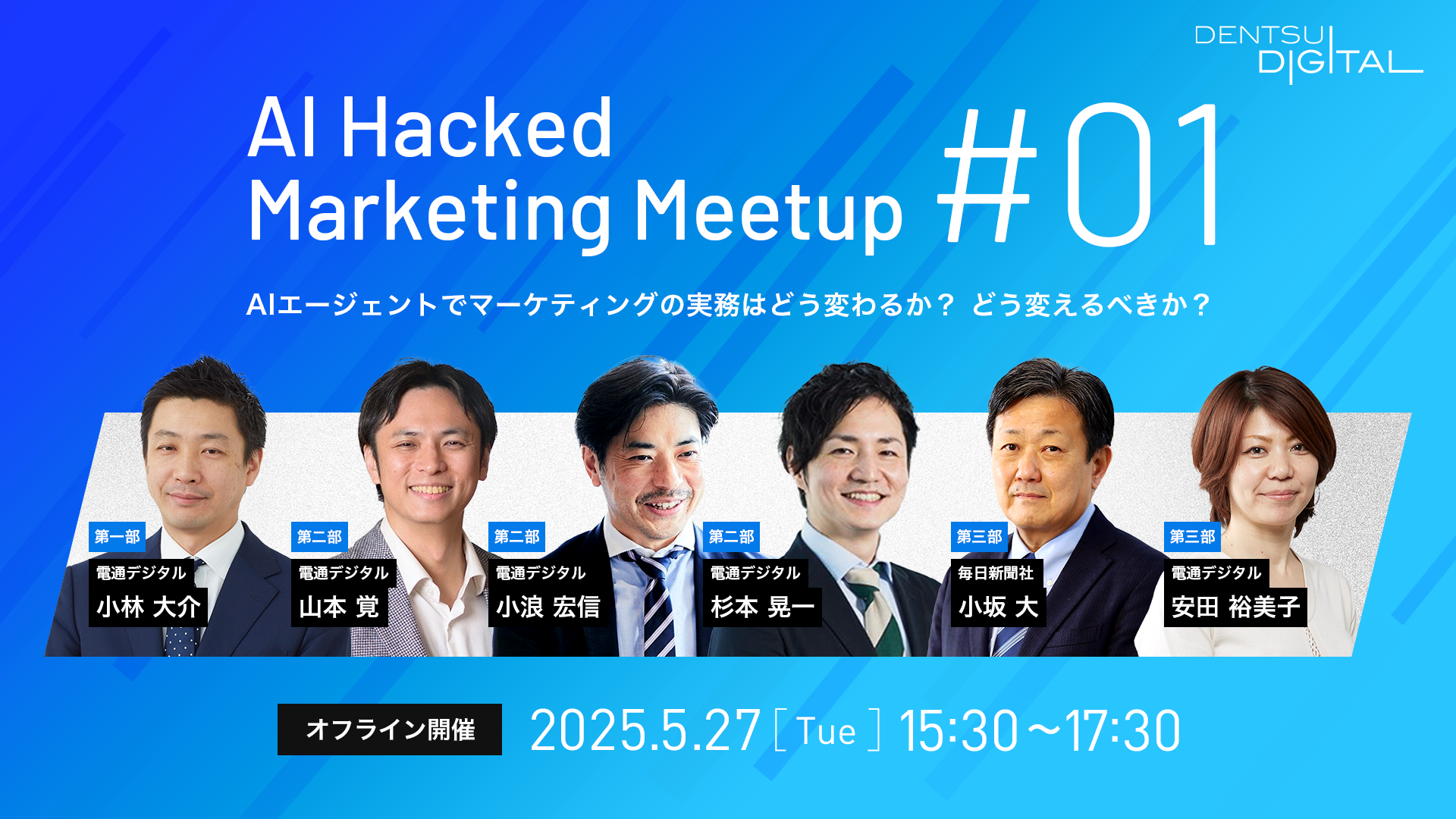 電通デジタルは、AIの黎明期から、いちはやくマーケティング領域でのAIによる事業成長・業務効率化をご支援して参りました。「AI Hacked Marketing Meetup」は、電通デジタルが培ってきた経験と、「∞AI」をはじめとする最新のAIソリューションに基づき、マーケティングがどのように今後変わるのか、未来展望と実践事例、ソリューションをご紹介するトークセッションです。