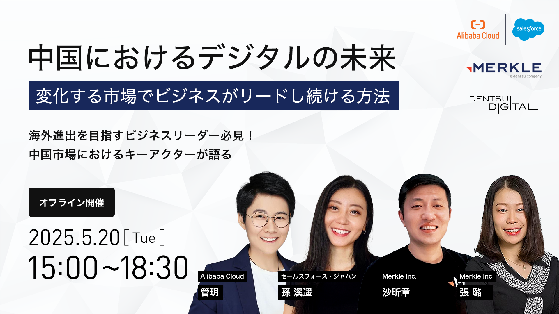 本セミナーでは、Salesforce、Alibaba Cloud、電通グループの中国市場のスペシャリストが集い、どのようにして中国の規制に適応しながらビジネスインフラと顧客接点戦略を描き、信頼構築とビジネス成長を実現するかの筋道を明らかにします。中国ビジネスの最新事情を学ぶ機会として、ぜひご参加ください。