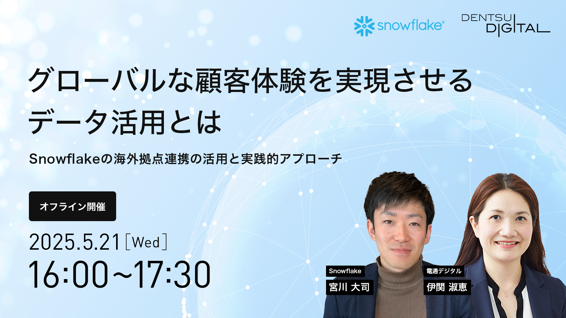 今回開催するオフラインセミナーでは、株式会社電通デジタルより、日本企業がグローバル展開で成功するための顧客体験およびデータ活用について、具体的な事例を交えてソリューションと共にご紹介いたします。Snowflake合同会社からは、Snowflakeを活用した海外拠点との連携についてお話いただきます。
