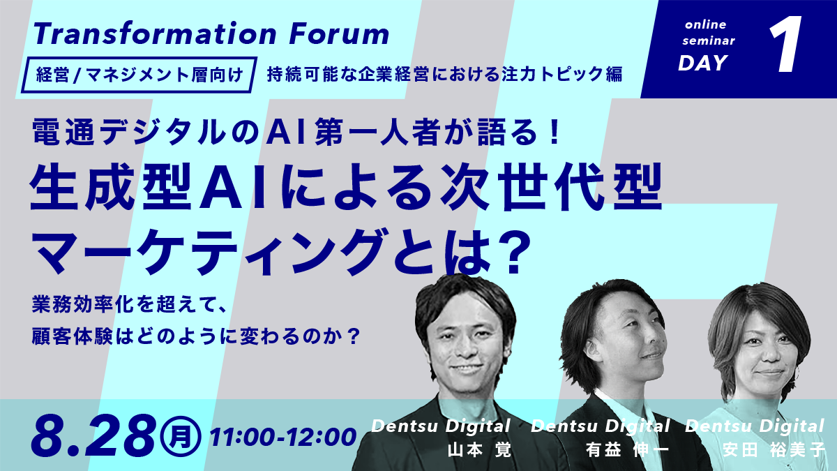 本セミナーでは、電通デジタルのAI第一人者より 生成型AIを取り入れた次世代型マーケティングの全体像や可能性、事例を交えた具体的な実践方法についてご紹介します。