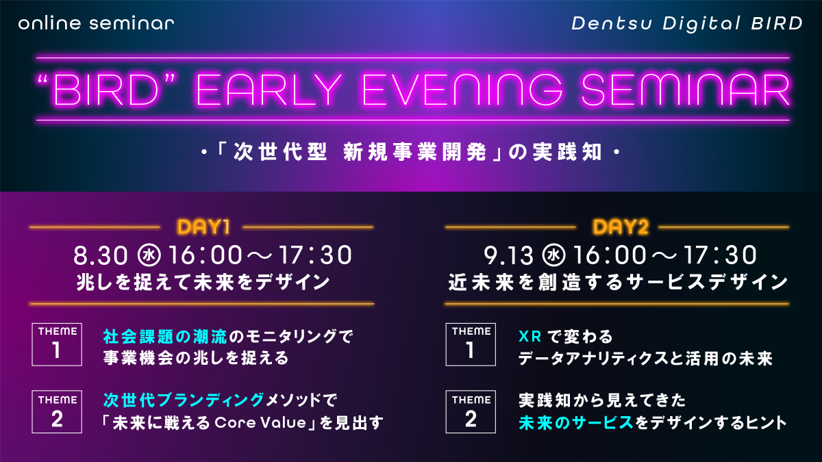 本セミナーは、「0」→「1」を生み出す新規事業開発を成功に導くメソッドについて、豊富な知見を有する専門家集団である「電通デジタルBIRD」の実践事例を踏まえながら、”次世代型”の新規事業立ち上げにおけるアイディエーション方法や、成果を出すための推進方法とその具体的なステップ、推進する上でのポイントをより実践に近い内容でご紹介します。