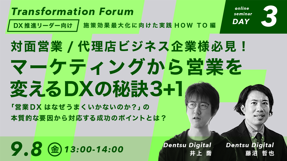 本セミナーでは、電通デジタルがこれまで多くのご支援の中で培った知見をもとにした「マーケティングから営業を変えるDXの秘訣3+1で、マーケティング起点での営業DX成功のポイントをお伝えします。