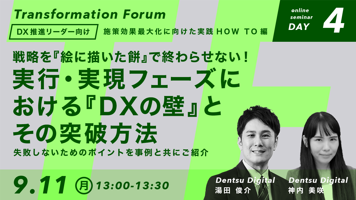 電通デジタルはクライアント企業と共に、数々の組織横断のDXを成功に導いてきました。その経験を独自のフレームワーク「DX ARROW」として提供しています。本セミナーでは、「DX ARROW」に実際に取り組んだ企業事例を交えながら、課題解決に向けたアクションやポイントをご紹介します。