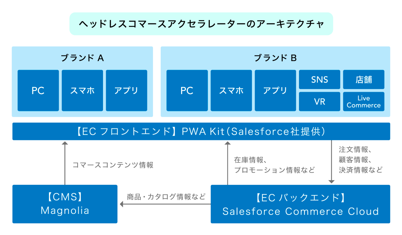 信頼性が高く長期的に活用できるECプラットフォーム「Salesforce Commerce Cloud」の強力なカタログ機能と注文機能にorと、商品情報などのコマースコンテンツを操作性の優れた「Magnolia Headless CMS」を統合しました。