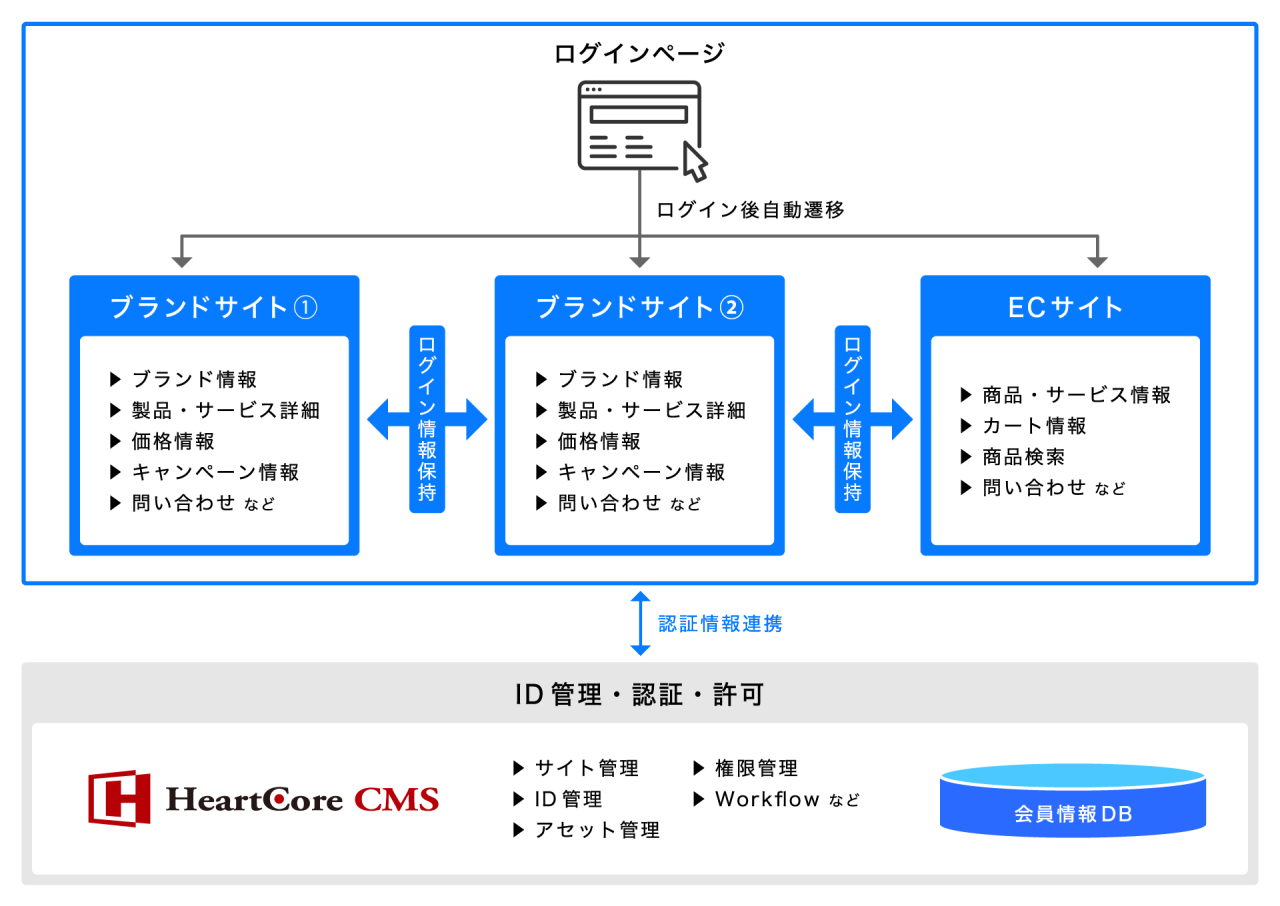 企業によっては複数のWebサイトを保有・管理している場合もありますが、個々のサイトでログイン情報が分かれることで顧客エンゲージメントの低下を招く可能性があります。そのような課題に対しシングルサインオン機能の導入が有効ですが、そういったサイトの管理にもHeartCore CMSを活用することが可能です。