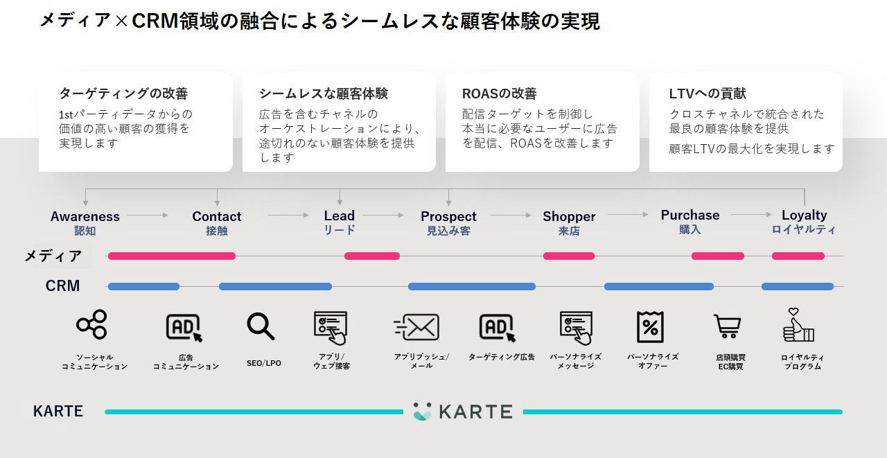 KARTEを用いてメディア領域とCRM領域間で相互にデータを共有し、ソーシャル、広告、実店舗、ECまであらゆるコミュニケーションを含む、チャネルごとに分断されない一貫したCXの提供を実現します。