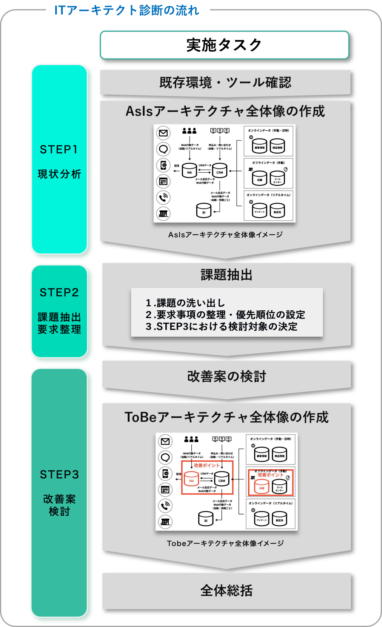まずはSTEP1~2でヒアリングを通じてAsIsアーキテクチャ全体像を作成し、ツール同士の連携や利用状況を可視化した後、UX・業務・システムの観点から課題点を抽出し、改善案の策定に向けた基盤を築きます。