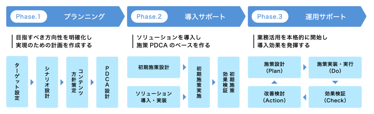 | 1 | プランニング | ターゲットに最適化したエンゲージメント戦略を立案します。ジャーニー設計を中心に、効果的なメッセージシナリオやコンテンツ戦略を整理します。 |