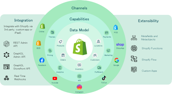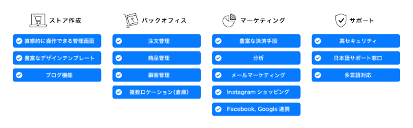 Shopifyは決済・在庫・物流、マーケティング自動化、多言語多通貨までECサイト構築に必須の基盤機能をクラウドで標準提供。