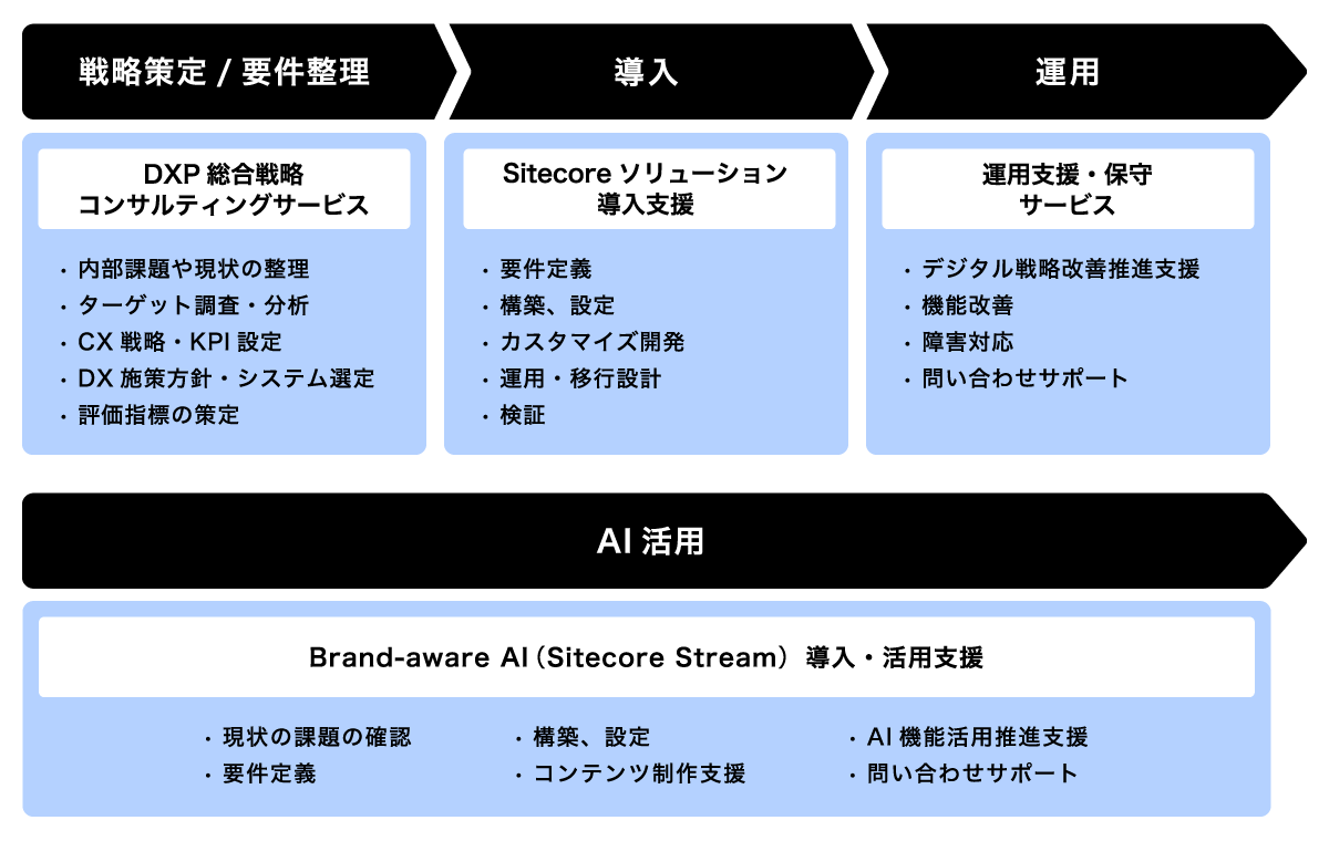 | Sitecore ソリューション導⼊⽀援 | Sitecore製品の単体導入・組み合わせ導入をサポートします。 |