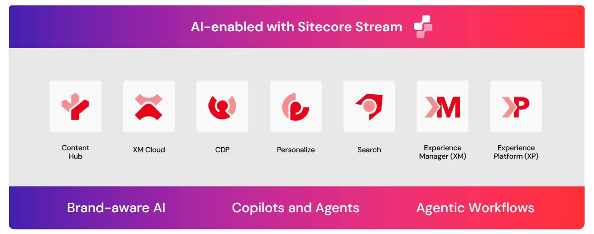 Sitecoreの各製品と接続して動作する、Brand-aware AI、Copilots and Agents、Agentic Workflowにより、コンテンツ制作からキャンペーン実行、顧客体験の最適化までを革新し、お客様のデジタル戦略・マーケティングを飛躍的に進化させます。