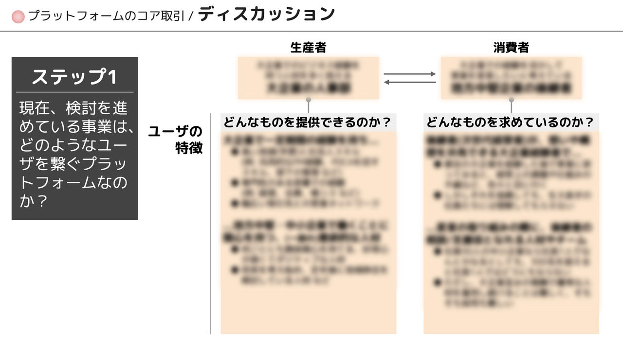 誰が誰と何をどのように取引するのか(=「コア取引」)を明確に定義することにより、新しいプラットフォームの戦略の軸を作っていきます。コア取引の設計は、プラットフォームの検証すべき要素を明らかにし、効果的な戦略立案の基盤を築くために重要です。