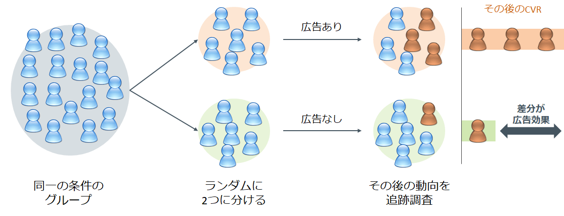 理想的には、広告配信の対象となるユーザー(同一のオーディエンス・セグメント)を、完全にランダムに2つのグループに分けて、片方には広告を配信し、片方には広告を配信しない、という調整を行い、その後のコンバージョン率を比較するという、RCT(ランダム化対照実験)のアプローチが最も正確性が高い、とされています。
