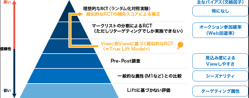 広告効果を、広告がなかった場合の自然発生分からの差分(=Lift)で評価する際に、「広告がなかった場合」をどのように再現・計算するかで、評価の確からしさは異なってきます。それぞれの手法の確からしさ=エビデンスレベルを評価すると、上図のように整理できます。