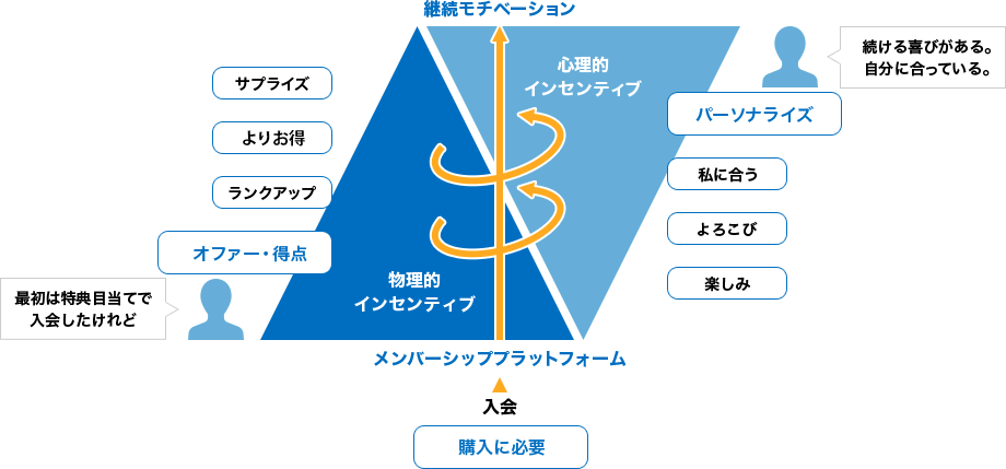 長期的にロイヤルティの醸成を図り、企業と顧客の絆を形成するモデル設計。継続モチベ―ションを、ポイントや割引などの物理的インセンティブから楽しみや嬉しさを感じられるような心理的インセンティブへスライドさせる設計が必要。