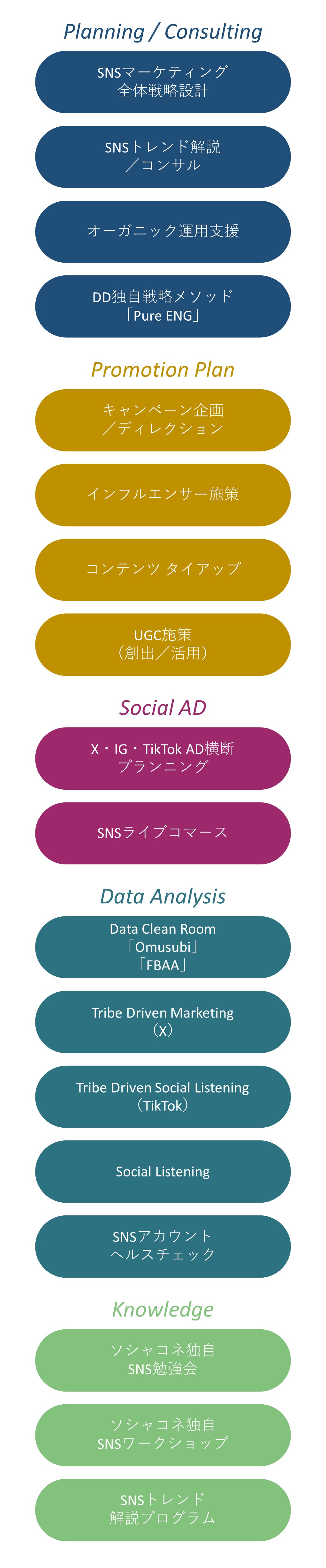 ソーシャルメディアを軸とした「長期的なマーケティング支援」「短期的なプロモーション支援」「データ・ナレッジの蓄積」をお客様の課題や昨今のトレンドに沿ってオーダーメイドで戦略・戦術を描き、独自のソリューションを活用しながらマーケティング活動を支援します。